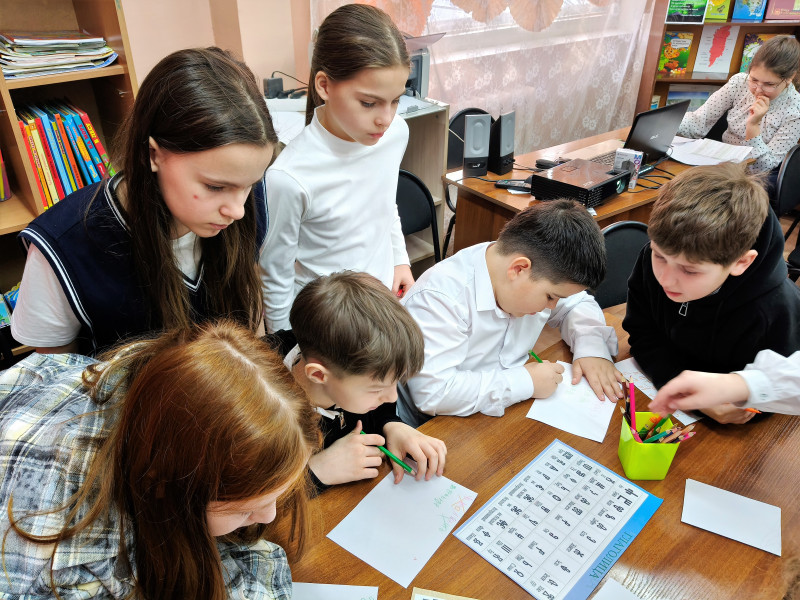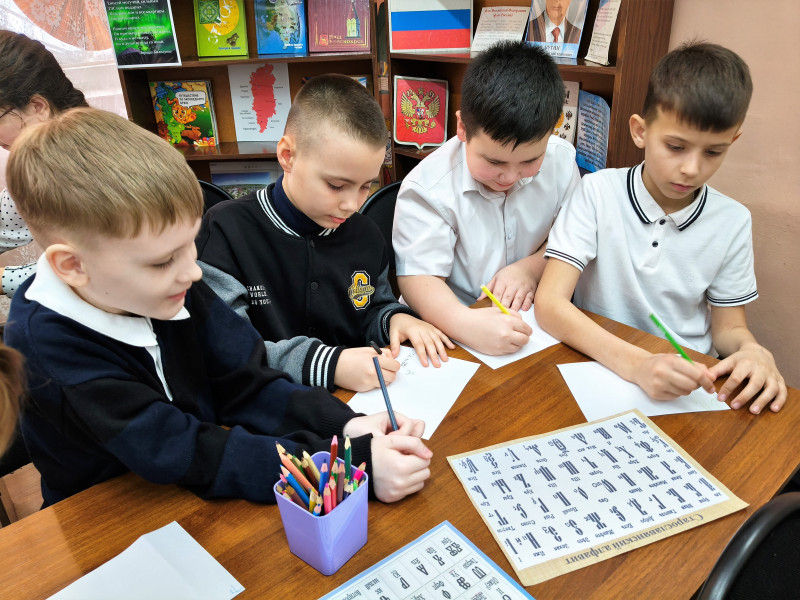 Путешествие завершилось интерактивной частью: школьники с увлечением отвечали на вопросы викторины о славянской азбуке и её создателях, разгадывали загадки о книгах и чтении, а затем попробовали себя в роли древнерусских писцов – вывели собственные имена славянскими буквами.