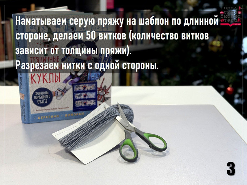 Наматываем серую пряжу на шаблон по длинной стороне, делаем 50 витков (количество витков зависит от толщины пряжи). Разрезаем нитки с одной стороны.