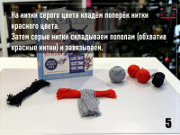 На нитки серого цвета кладем поперёк нитки красного цвета. Затем серые нитки складываем пополам (обхватив красные нитки) и завязываем.