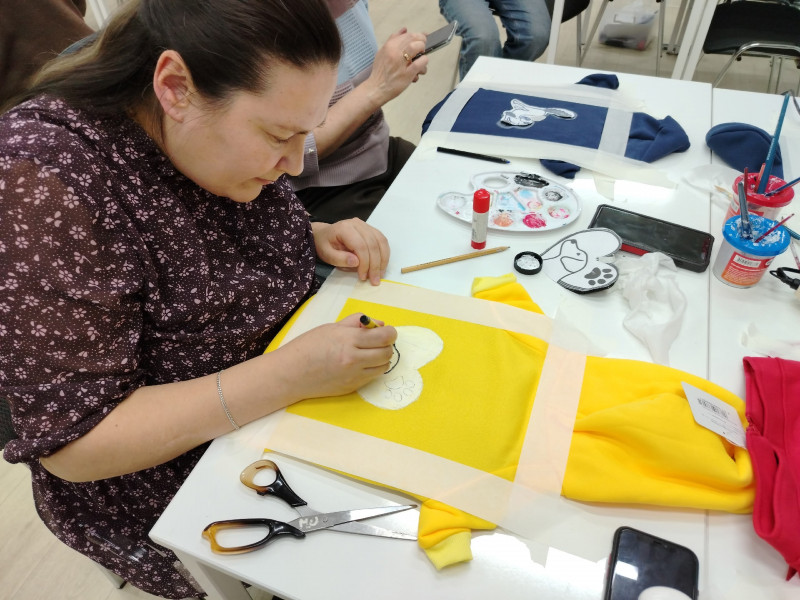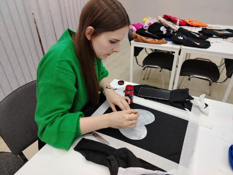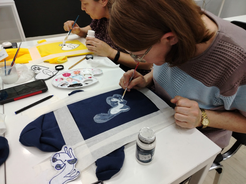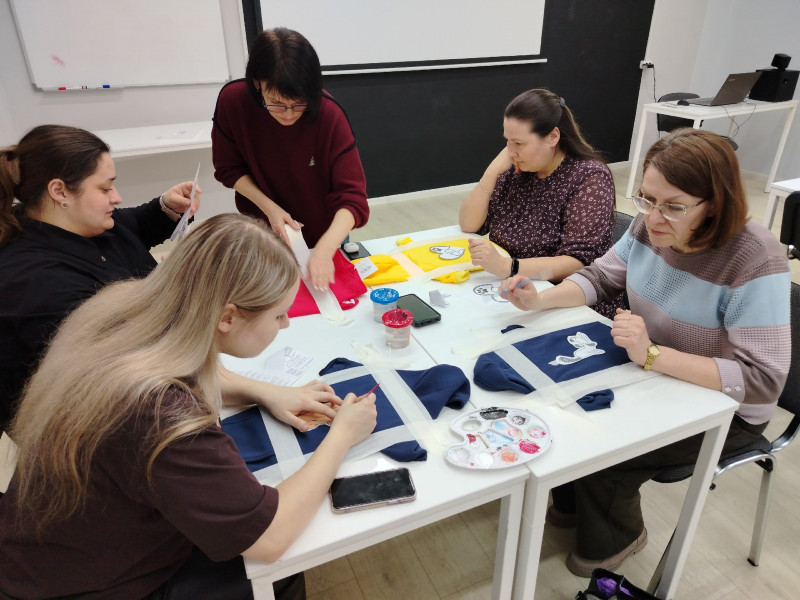 Наставником встречи выступила мастер декоративно-прикладного творчества Елена Царенко. Под её руководством участники мастер-класса освоили тонкости росписи по ткани, превратив однотонные вещи в яркие авторские изделия. В ход шли краски, кисти, трафареты и безграничная фантазия.