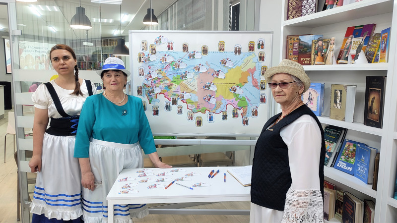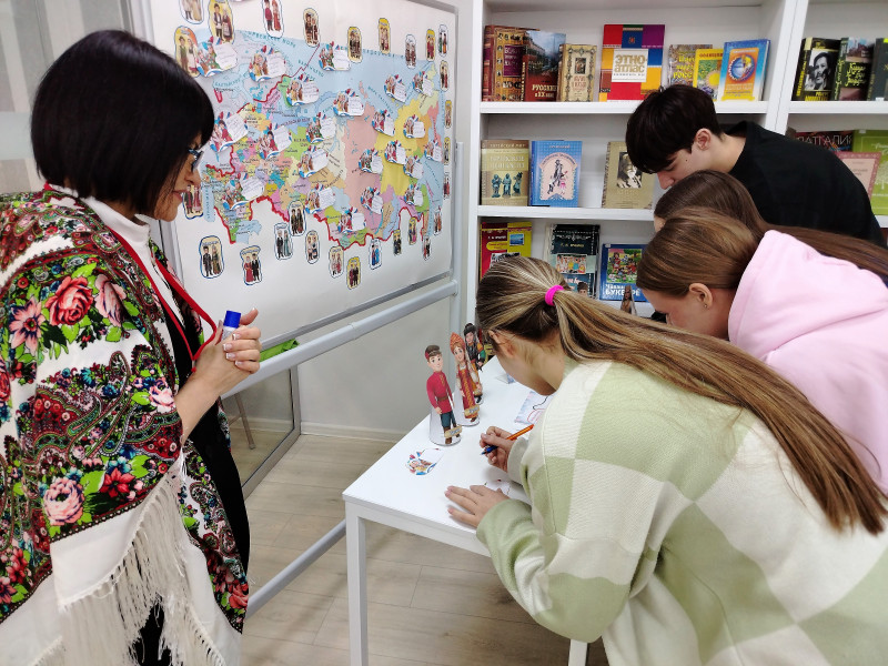 Одновременно с торжественной церемонией в модельной библиотеке прошла увлекательная квест‑игра «Культура и традиции народов России». Участники отправились в захватывающее путешествие по шести станциям, где их ждали задания, раскрывающие многообразие обычаев, фольклора и народных промыслов нашей страны.