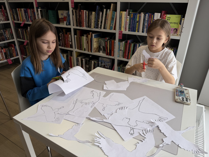 Ребята своими руками вырезали из бумаги праздничные элементы. Кто-то мастерил белоснежных голубей, кто-то – журавлей. После мастер-класса дети и библиотекари вместе украсили окна библиотеки. Получилось ярко, аккуратно и очень душевно.