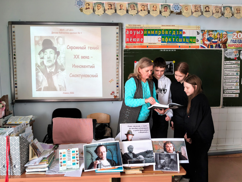 В детской библиотеке-филиале № 3 для учащихся школы № 11 им. Героя Советского Союза Ф. А. Колтыги прошла игра-биография «Вы называли меня гениальным актёром…». Ребятам предстояло проверить свои знания в советской фильмографии: угадать название фильма и роль актёра по фрагменту на экране, вспомнить как можно больше ролей Смоктуновского, ответить на вопросы о его жизненном пути и театральном творчестве. Блицвопросы, интересный видеоряд и атмосфера старого доброго кино сделали эту встречу по-настоящему захватывающей.