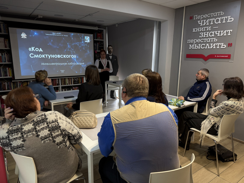 Городская библиотека им. А.П. Чехова пригласила любителей хорошего кино в интеллектуальную лабораторию «Код Смоктуновского». Мероприятие стало настоящим погружением в кинематографическую вселенную актёра. Участники, выступая в роли исследователей, решали аудиозагадки, отвечали на видеовопросы, разбирали знаковые сцены – всё это помогло им приблизиться к разгадке «кода гениальности» великого артиста. Для участников это стало возможностью заново взглянуть на известные образы и узнать новые факты из жизни и карьеры любимого актёра.