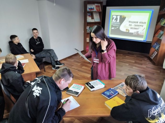 В рамках года Единства народов России для студентов Ачинского колледжа отраслевых технологий и бизнеса в Юношеской библиотеке состоялось мероприятие, посвящённое Международному дню родного языка. В ходе мероприятия участники смогли посоревноваться в интеллектуальных состязаниях «Знаешь ли ты русский язык?», «Из слова – слово, но другое», «Лингвистические загадки», «Поставь ударение». Подсказку они смогли найти в словарях по русскому языку.